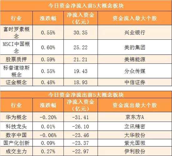 概念板塊方面,今日富時羅素概念、MSCI中國概念、股票質押、標普道瓊斯概念等概念板塊資金呈現(xiàn)凈流入,其中富時羅素概念凈流入30.35億元居首。