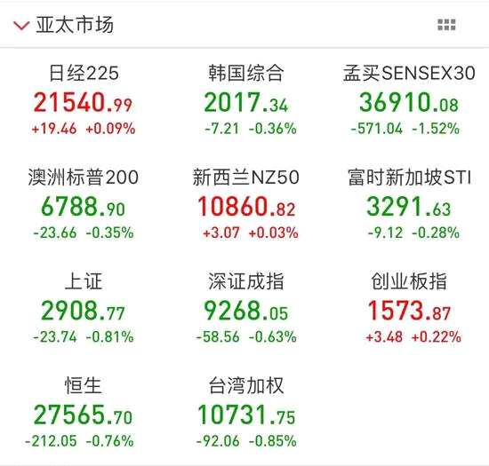 亞太市場,滬指下跌0.81%,深成指下跌0.63%,恒生指數(shù)下跌0.76%,臺灣加權(quán)指數(shù)下跌0.85%;日經(jīng)225微漲0.09%。