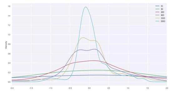 可以看出最短的持有期限1天,這跟分布接近于一根直線(接近直線意味著出現(xiàn)各種收益率的概率相差不大,最典型的例子就是扔骰子的概率分布,就是嚴(yán)格的一條直線),也就是說,就滬深300指數(shù)而言,如果你只持有一天,收益率的波動幾乎接近于隨機(jī)波動,沒有什么規(guī)律可言。而如果我們觀察的持有期限拉長,將會發(fā)現(xiàn)其收益率分布出現(xiàn)了顯著的變化,中間的峰會變尖、且尾部兩邊的分布(極端收益率的分布)會變的更薄,并且隨著持有時間的增長,這種變化是漸變的,到最長的觀測期限250天時,其概率分布曲線則演變成了和持有期限為一天的曲線截然不同的形狀。