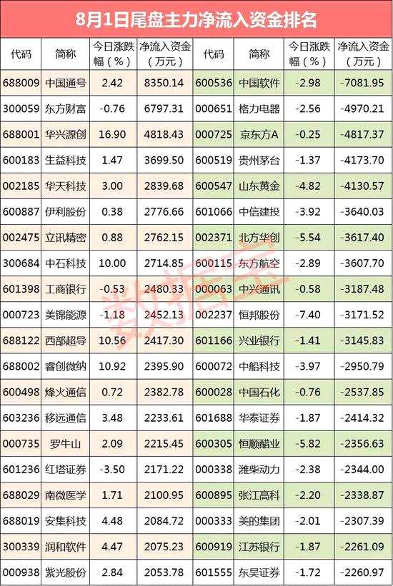 從個(gè)股來看,中國通號(hào)、東方財(cái)富、華興源創(chuàng)三只個(gè)股尾盤資金凈流入靠前,分別凈流8350萬元、6797萬元和4818萬元,三只個(gè)股都不通程度出現(xiàn)拉尾盤情況,其中華興源創(chuàng)一度飆漲20%。中國軟件、格力電器、京東方A尾盤資金凈流出靠前,分別凈流出7081萬元、4970萬元和4817萬元。