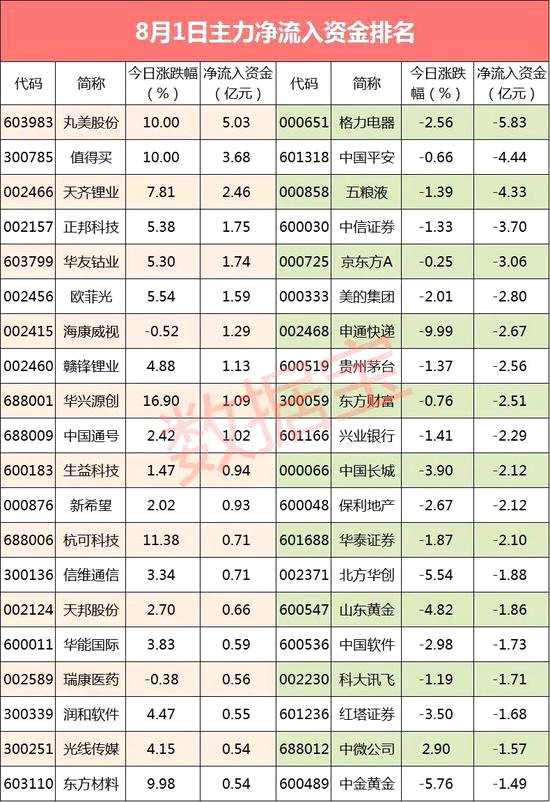 在主力資金流入靠前的個(gè)股中,丸美股份和值得買兩只近期上市的次新股流出居前,分別凈流入5億元和3.68億元。鋰電池龍頭【天齊鋰業(yè)(002466)、股吧】流入金額排名第三,今日流入2.46億元,股價(jià)收漲近8%。另外,飼料行業(yè)的正邦科技凈流入1.75億元,華友鈷業(yè)流入1.74億元。