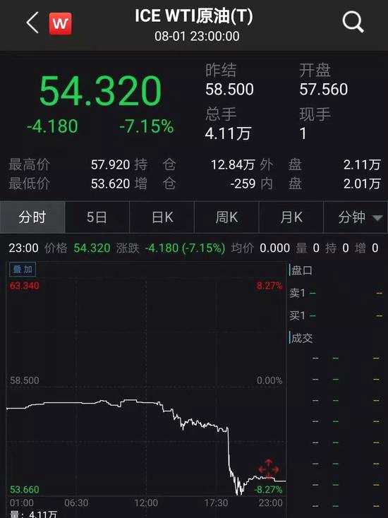 A50則一度暴跌超3%。A50則一度暴跌超3%。  紐約商品交易所9月交割的西德州中質(zhì)原油(WTI)期貨價格重挫4.63美元,跌幅達(dá)7.9%,收于53.95美元/桶,創(chuàng)6周以來的最低收盤價。這是主力WTI期貨4年來的最大單日跌幅。