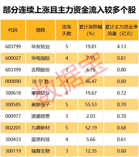 值得注意的是,158只連續(xù)上漲個(gè)股中,12只個(gè)股期間主力資金累計(jì)凈流入超過5000萬(wàn)元。其中,累計(jì)資金流入最多的為華友鈷業(yè),主力資金累計(jì)流入4.13億元。
