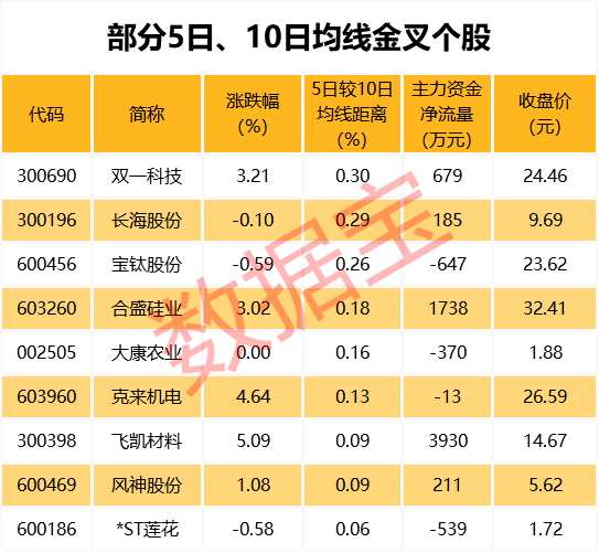 截至8月1日收盤,有9只A股的5日均線主動(dòng)上穿10日均線,其中雙一科技、長(zhǎng)海股份、寶鈦股份等個(gè)股的5日均線較10日均線距離最大,分別達(dá)0.3%、0.29%、0.26%。值得注意的是,飛凱材料、合盛硅業(yè)、雙一科技等個(gè)股主力資金凈流入居前。