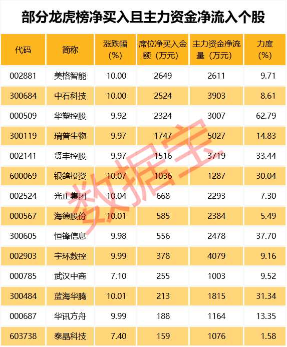 從盤口資金流向來看,主力資金凈流入超千萬(wàn)且龍虎榜凈買入個(gè)股共有14只,其中瑞普生物、宇環(huán)數(shù)控、中石科技等個(gè)股資金凈流入金額最大。凈流入力度最大的個(gè)股有華塑控股、恒鋒信息、賢豐控股,凈流入力度分別為62.79%、37.7%、33.44%。
