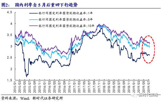 雖然美聯(lián)儲(chǔ)貨幣政策低于預(yù)期,但國(guó)內(nèi)利率下行更快了。2019年3-4月,受到政策微調(diào)和【農(nóng)產(chǎn)品(000061)、股吧】漲價(jià)影響,國(guó)內(nèi)利率有較大的上行,但5月后,利率重回下降趨勢(shì)。雖然美聯(lián)儲(chǔ)貨幣寬松低于預(yù)期,但國(guó)內(nèi)利率下行速度最近反而更快了。而從數(shù)據(jù)上來(lái)看,下行更快的主要是長(zhǎng)端利率。我們認(rèn)為,當(dāng)下雖然處在經(jīng)濟(jì)下行階段,但由于處在末端,而利率的下行可以穩(wěn)定股市的配置價(jià)值,所以A股對(duì)經(jīng)濟(jì)下行的擔(dān)心釋放的過(guò)程可能會(huì)比較平緩,而不是快速下行。