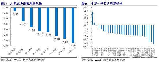 上周A股全線(xiàn)下跌,以上證50和滬深300領(lǐng)跌,跌幅分別為3.25%和2.88%。除農(nóng)林牧漁(3.67%)和有色金屬(0.76%)上漲其余行業(yè)均下跌,其中跌幅居前的行業(yè)為房地產(chǎn)(-5.36%)、非銀金融(-4.72%%)和建筑材料(-4.55%)。概念類(lèi)中,次新股指數(shù)(8.72%)、稀土指數(shù)(6.57%)和打板指數(shù)(5.08%)領(lǐng)漲,維生素指數(shù)(-6.87%)、創(chuàng)投指數(shù)(-6.13%)和西部水泥指數(shù)(-5.84%)領(lǐng)跌。