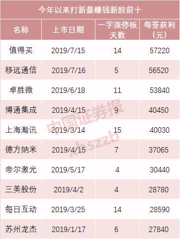 今年以來上市新股中,每簽獲利超過2萬元的新股共有22只。其中,值得買、移遠(yuǎn)通信、卓勝微的每簽獲利均超過了5萬元,位居前三。