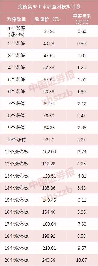 附:海能實業(yè)上市后每簽盈利模擬計算