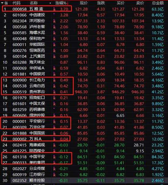 具體個股中,五糧液大漲3.7%;【貴州茅臺(600519)、股吧】逆勢上漲0.41%,收報946.3元;長江電力漲0.49%,萬科A也逆勢上漲;中國平安僅是微跌。