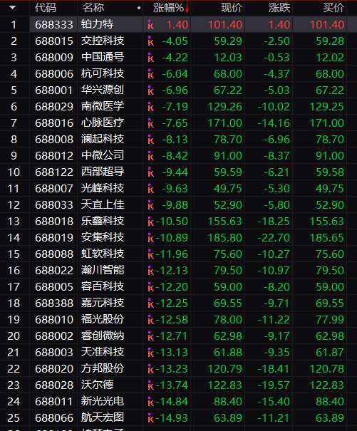 今日收盤,25只科創(chuàng)板股票僅有1只鉑力特上漲1.4%,13只跌幅超10%,航天宏圖、【新光光電(688011)、股吧】跌近15%。這些股票基本都是尾盤大跳水。