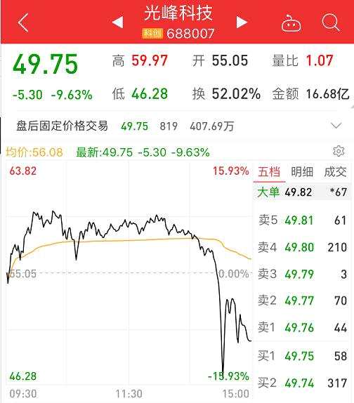 以光峰科技來看,盤中一度漲近10%,到午后仍有漲逾8%,然而到14:21開始兇猛跳水跌逾15%,而后有所拉升最終收盤仍跌近10%。
