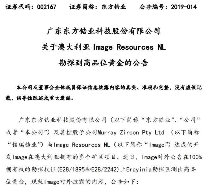 東方鋯業(yè)(維權)2019年3月1日晚間公告,公司及其控股子公司Murray Zircon Pty Ltd (“銘瑞鋯業(yè)”)與Image Resources NL(“Image”)達成的開發(fā)Image在澳大利亞擁有的多個礦區(qū)項目。近日,Image對外公告在100%擁有權的勘探權證(E28/1895和E28/2242)上Erayinia勘探區(qū)測出高品位黃金。