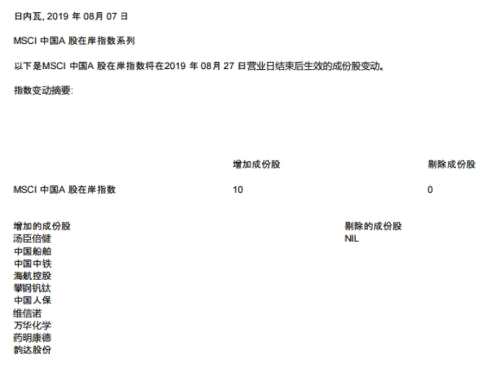另外,共計(jì)10只個(gè)股添加到MSCI A股在岸指數(shù),該項(xiàng)無(wú)剔除,其中前三大標(biāo)的包括中國(guó)人保,中國(guó)中鐵,萬(wàn)華化學(xué),其余標(biāo)的包括湯臣倍健、中國(guó)船舶、海航控股 、攀鋼釩鈦、 維信諾、藥明康德、 韻達(dá)股份。值得注意的是,此前6月,MSCI公布基于可投資性方面的考量,首創(chuàng)股份、浙能電力、雅戈?duì)枴ⅰ?a href="http://m.xfjyyzc.com/gegu/600518/" target="_blank" title="ST康美(600518)股票分析,新聞,資金流向,財(cái)務(wù)數(shù)據(jù)" >ST康美(600518)、股吧】已從指數(shù)中剔除。