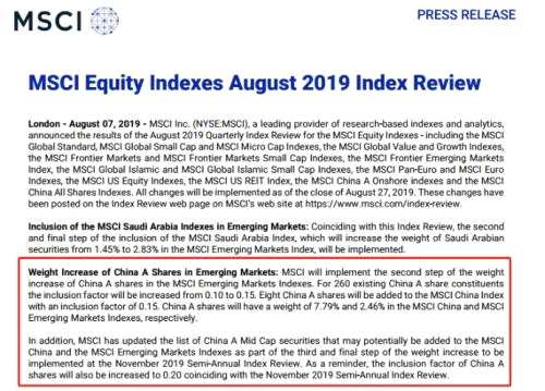 北京時(shí)間8月8日早晨,MSCI公布8月季度評(píng)議的最終決定。作為2019年8月季度指數(shù)審議的一部分,MSCI把中國(guó)大盤A股納入因子從10%增加至15%,將在8月27日收盤后生效。