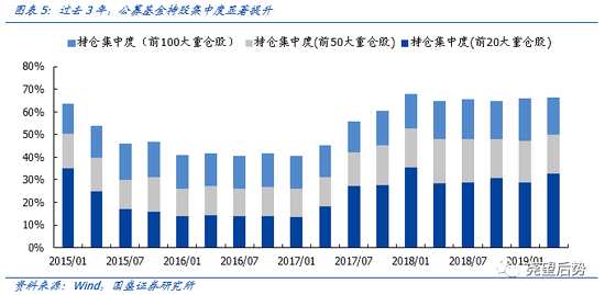 以公募為例,其持股結(jié)構(gòu)持續(xù)在向核心資產(chǎn)集中。截至2019年一季度,公募持股總規(guī)模達(dá)到1.95萬(wàn)億,約占A股總流通市值4.4%。從2016年Q1股市結(jié)束大幅波動(dòng)至今,公募的持倉(cāng)結(jié)構(gòu)發(fā)生了明顯變化。首先,從持倉(cāng)集中度角度看,公募基金過去3年持股呈現(xiàn)出明顯集中化趨勢(shì),其中前50大重倉(cāng)股市值占比從2016年的27%上升至目前的50%,前100大重倉(cāng)股市值占比則從40%上升至目前65%。其次,在行業(yè)層面,公募持股分布明顯向食品飲料、金融地產(chǎn)、家電集中,而TMT和周期板塊倉(cāng)位則普遍下滑;最后,對(duì)比公募和外資(北上)重倉(cāng)股名單,可以發(fā)現(xiàn)過去3年內(nèi)外資金重倉(cāng)股重合度也在不斷提升。