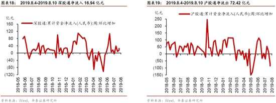 8月以來,A股估值受人民幣匯率貶值等影響,大幅下跌。估值方面,以前兩次市場(chǎng)風(fēng)險(xiǎn)偏好快速下行時(shí)期為參照——上一輪貿(mào)易協(xié)商不確定性上升和央行宣布接管包商銀行時(shí)期,期間市場(chǎng)估值分別在5/20、6/6達(dá)到相對(duì)低點(diǎn)。截止8月8日,上證50、滬深300、創(chuàng)業(yè)板指、萬得全A、上證綜指的PE TTM已回到前兩次估值低點(diǎn)附近。投資者情緒方面,近一周(8/5-8/9),產(chǎn)業(yè)資本凈減持30億元,低于年初以來平均每周36億凈減持;深股通凈流入16.94億元、滬股通凈流出72.42億元,合計(jì)流出55.48億元;融資余額下降99.68億元,接近5/20-5/24水平。