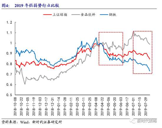 ?。?)板塊輪動(dòng)也處在尾聲。市場(chǎng)每一輪大的調(diào)整后期都會(huì)出現(xiàn)強(qiáng)勢(shì)股補(bǔ)跌,本輪市場(chǎng)調(diào)整自4月下旬開始,前期強(qiáng)勢(shì)行業(yè)食品飲料自7月以來也開始調(diào)整。鑒于年初以來的最強(qiáng)勢(shì)板塊食品飲料已經(jīng)持續(xù)弱勢(shì)1個(gè)月,指數(shù)層面最大的風(fēng)險(xiǎn)已經(jīng)過去。2019年初的上漲,表現(xiàn)最為強(qiáng)勢(shì)的行業(yè)是農(nóng)林牧漁和食品飲料,表現(xiàn)最弱的行業(yè)是鋼鐵和建筑。4月下旬至6月初的調(diào)整過程中,前期強(qiáng)勢(shì)的行業(yè)表現(xiàn)仍然強(qiáng)勢(shì),并未跟隨指數(shù)下跌;而前期弱勢(shì)的行業(yè)鋼鐵和建筑,下跌幅度則超過上證指數(shù)。調(diào)整的后半段,指數(shù)橫向震蕩,農(nóng)林牧漁、食品飲料震蕩走強(qiáng),鋼鐵和建筑則震蕩回落。6月中下旬指數(shù)小幅反彈,食品飲料指數(shù)創(chuàng)出新高。自7月起,食品飲料行業(yè)開始調(diào)整,至今已經(jīng)調(diào)整一個(gè)月以上。(詳見報(bào)告《板塊輪動(dòng)的尾聲》)。