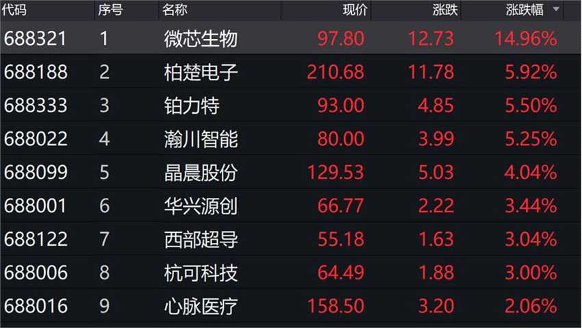 科創(chuàng)板方面,個(gè)股早盤(pán)普漲,僅沃爾德一股下跌。截至上午收盤(pán),微芯生物大漲14.96%,柏楚電子、鉑力特漲幅超過(guò)5%。