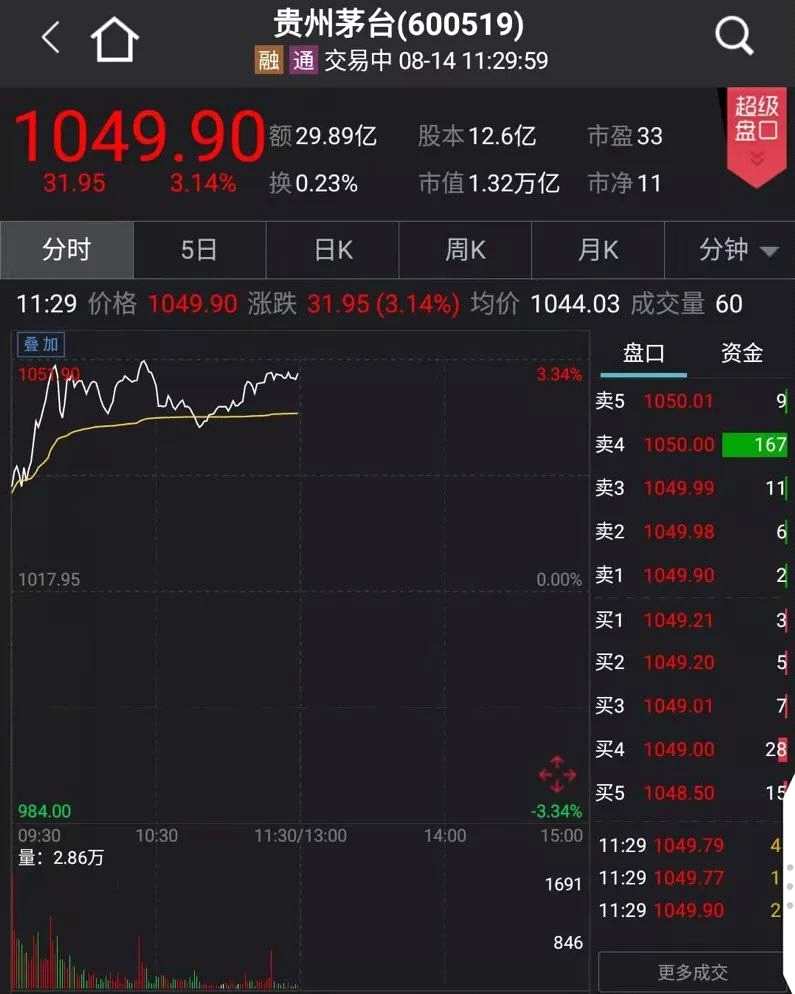 個(gè)股表現(xiàn)方面,貴州茅臺(tái)盤(pán)中一度上漲超3%,股價(jià)觸及1051元,創(chuàng)歷史新高。
