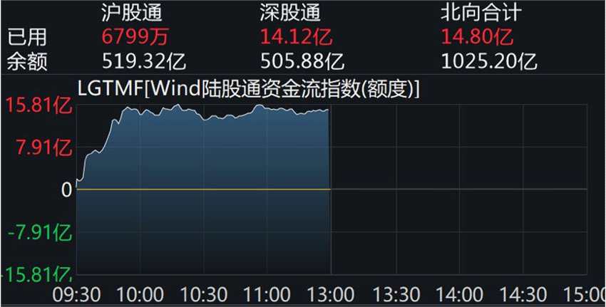 從外資動(dòng)向來(lái)看,北上資金表現(xiàn)活躍,半日凈流入超過(guò)14億元。