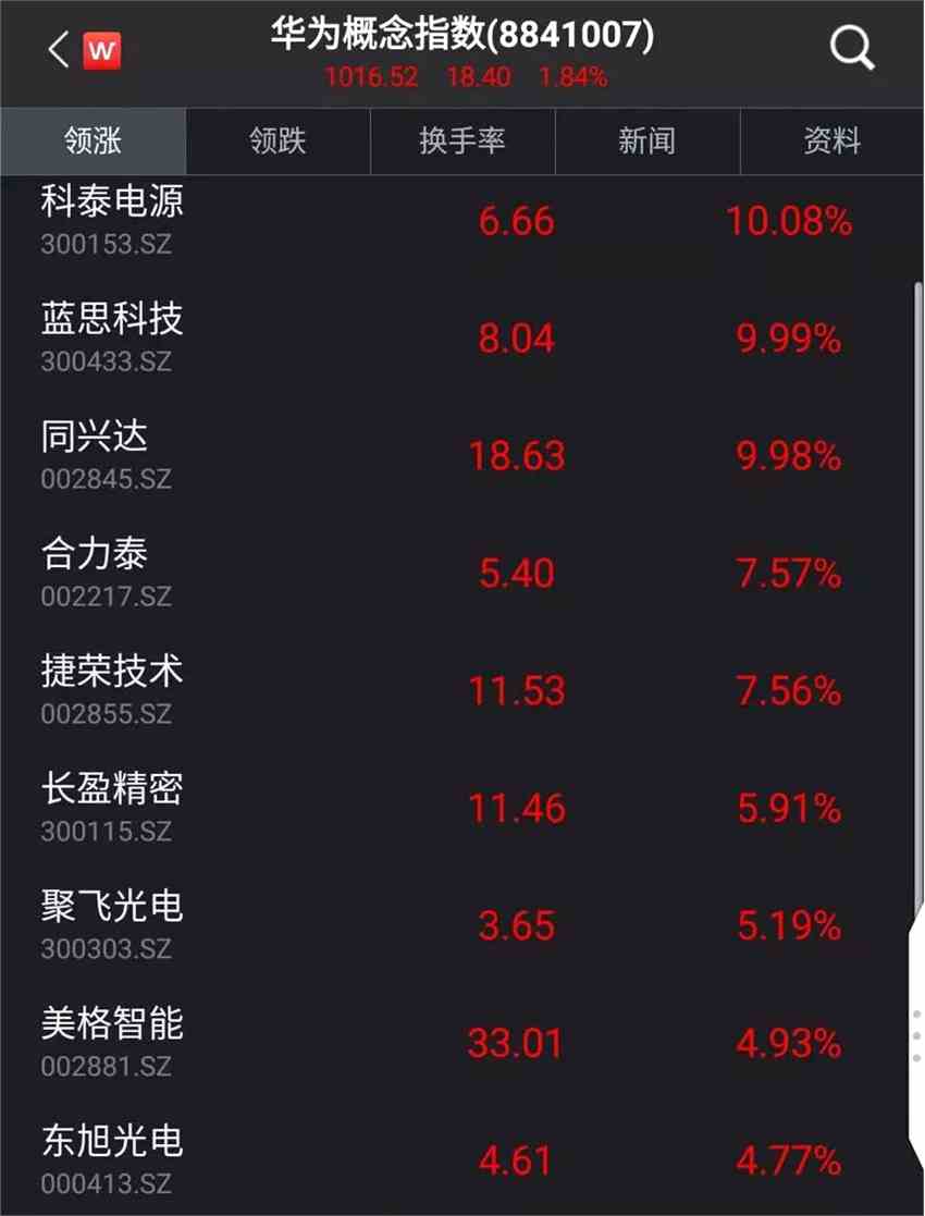 華為概念股全線飄紅,科泰電源、藍(lán)思科技、同興達(dá)漲停,合力泰、捷榮技術(shù)漲逾7%。