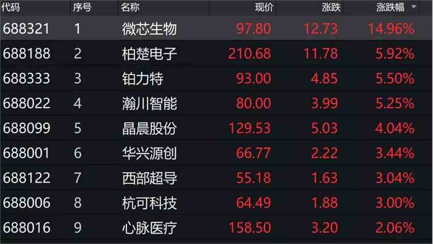 科創(chuàng)板方面,個(gè)股早盤普漲,僅沃爾德一股下跌。截至上午收盤,微芯生物大漲14.96%,柏楚電子、鉑力特漲幅超過5%。