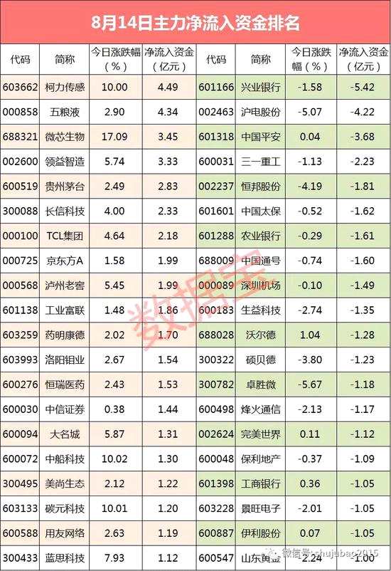 從個股來看,今日有22股資金凈流入超億元,同時有19股流出超億元??铝鞲?、五糧液兩只個股流入金額超4億元??铝鞲惺墙谏鲜械拇涡鹿桑袢帐锥乳_板,今日全天換手率近60%,尾盤仍舊封住漲停板。微芯生物和領(lǐng)益智造主力凈流入超3億元。貴州茅臺、長信科技和TCL集團流入金額超2億元。