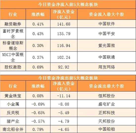概念板塊方面,今日融資融券、富時(shí)羅素概念、標(biāo)普道瓊斯概念、MSCI中國概念等概念板塊資金呈現(xiàn)凈流入,其中融資融券概念凈流入141.68億元居首。