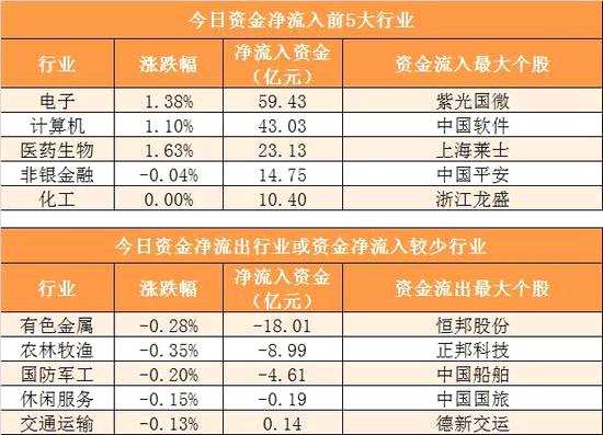 28個(gè)申萬一級行業(yè)中,24個(gè)行業(yè)實(shí)現(xiàn)資金凈流入,其中電子行業(yè)凈流入59.43億元居首。