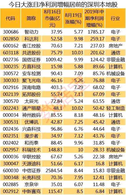 從發(fā)布中報股業(yè)績來看,今日漲幅超5%的156只深圳股中,19股今年中期實現(xiàn)盈利且同比增幅超20%。凈利潤翻番股有智動力、科達利、香江控股、共進股份及國信證券。另外,方直科技、安車檢測、【深南電路(002916)、股吧】也取得了不錯的業(yè)績。