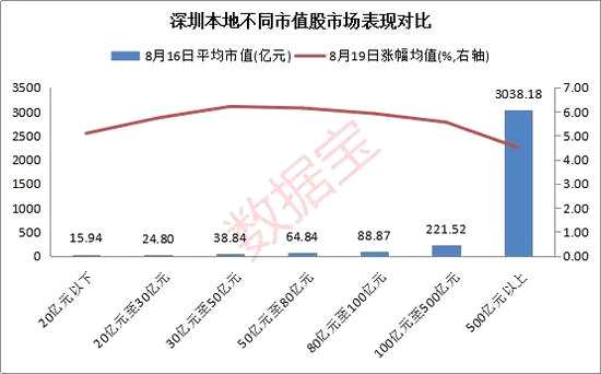 梳理發(fā)現(xiàn),上漲股特征較為明顯,小市值股上漲動力更足。證券時報·數(shù)據(jù)寶統(tǒng)計顯示,漲停的53股中,上一交易日(8月16日)市值低于百億元非ST個股共有42只,占前者比例近八成。其中,【迪威迅(300167)、股吧】、深天地A、絲路視覺3股市值低于20億元。將市值按照范圍進行劃分,統(tǒng)計顯示,市值超500億元平均漲幅最低,僅4.5%,市值位于30億元至50億元、50億元至80億元的深圳本地股平均漲幅均超過6%。