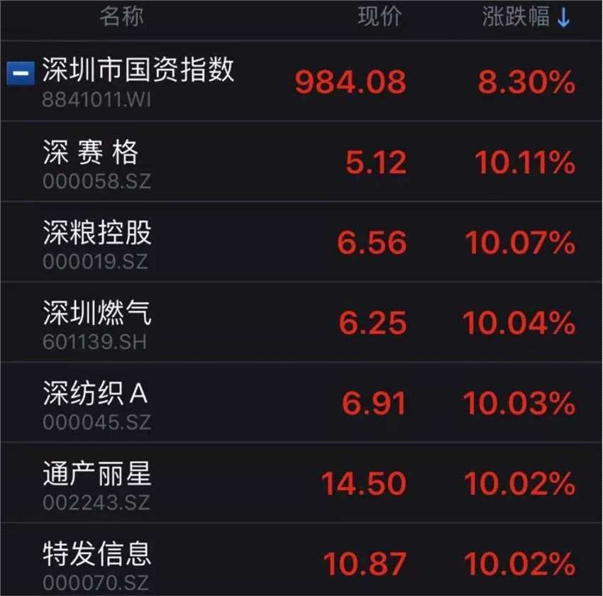深圳本地股是今日市場(chǎng)的最大亮點(diǎn),深圳本地股有超過(guò)60只個(gè)股漲停。深圳市國(guó)資指數(shù)上漲8.30%,位居概念板塊漲幅首位,板塊內(nèi)深賽格、【深糧控股(000019)、股吧】、深圳燃?xì)?、深紡織A、通產(chǎn)麗星、特發(fā)信息、深圳能源等16只個(gè)股漲停,僅深圳市國(guó)資板塊內(nèi)的漲停個(gè)股一個(gè)屏幕已經(jīng)裝不下了。