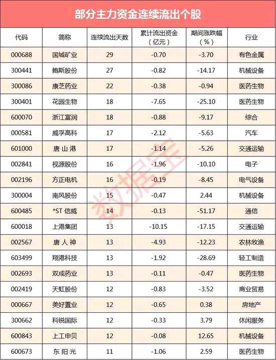 資金流向:3股主力資金連續(xù)流出超20個交易日
