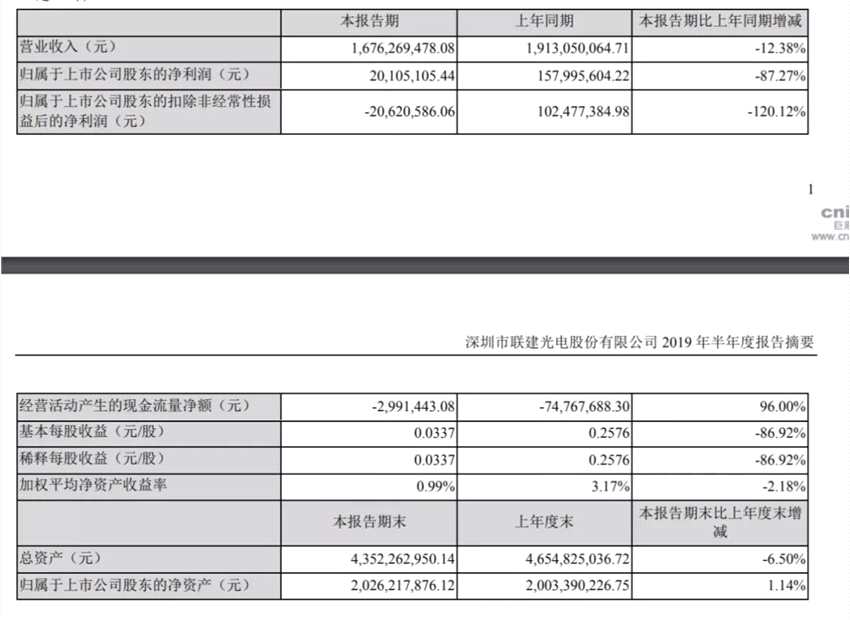 再來(lái)看兩連板的【聯(lián)建光電(300269)、股吧】。8月18日,聯(lián)建光電披露半年報(bào)顯示,上半年?duì)I收同比下降12.38%,凈利潤(rùn)同比下降87.27%,扣除非經(jīng)常性損益后的凈利潤(rùn)下降120.12%。