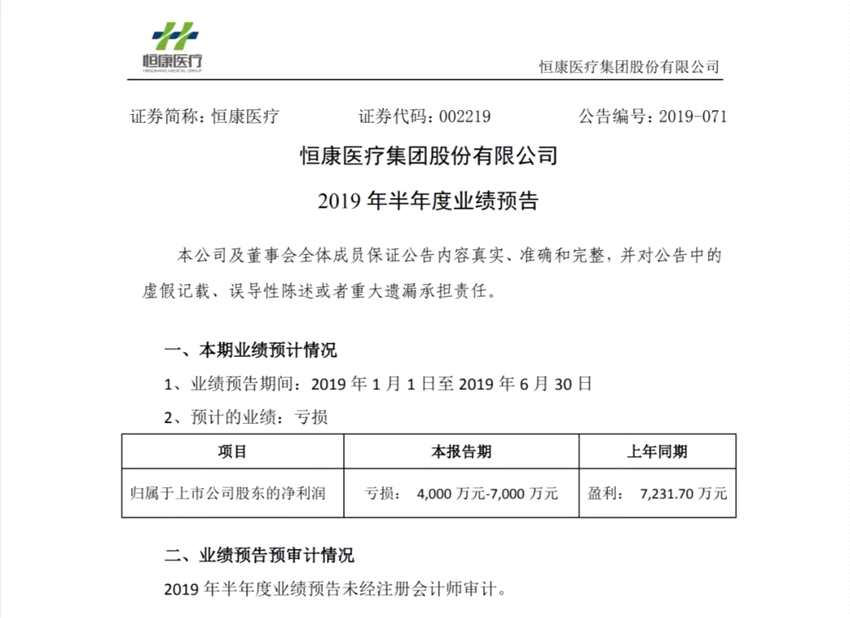 連續(xù)3個(gè)交易日漲停的【恒康醫(yī)療(002219)、股吧】,截至目前尚未公布半年報(bào)。從此前發(fā)布的半年度業(yè)績(jī)預(yù)告來(lái)看,恒康醫(yī)療預(yù)計(jì)今年上半年虧損4000萬(wàn)元-7000萬(wàn)元,而上年同期盈利7231.70萬(wàn)元。