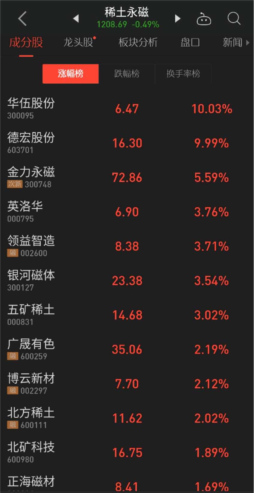 受政策消息的提振影響,稀土價(jià)格進(jìn)一步上漲的預(yù)期再度提高,稀土板塊在8月30日強(qiáng)勢(shì)爆發(fā),華伍股份、金力永磁、德宏股份等股票盤(pán)中漲停,銀河磁體、【正海磁材(300224)、股吧】、北方稀土等一批稀土行業(yè)公司股價(jià)異動(dòng)明顯。