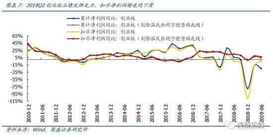 創(chuàng)業(yè)板整體2019Q2的凈利潤(rùn)同比增速為-24.62%,較2019Q1的-16.74%下降了7.88%;扣非凈利潤(rùn)同比增速為-4.30%,較2019Q1的-17.26%回升了12.96%。創(chuàng)業(yè)板剔除溫氏樂(lè)視寧德堅(jiān)瑞光線2019Q2凈利潤(rùn)同比增速為7.40%,較2019Q1的10.46%下降了3.06%;扣非凈利潤(rùn)同比增速為6.25%,較2019Q1的7.93%下滑1.69%。