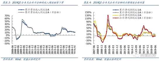 全部A股整體2019Q2的營(yíng)業(yè)收入同比增速為10.36%,較2019Q1的11.87%下降1.51%;全部A股非金融的2019Q2的營(yíng)業(yè)收入同比增速為9.57%,較2019Q1的10.55%下降0.97%。