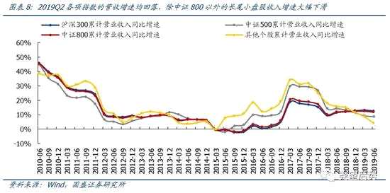 從指數(shù)的角度來(lái)看,大盤(pán)股的代表滬深300的營(yíng)業(yè)收入同比增速為12.59%,較2019Q1的13.30%下降0.72%;中盤(pán)股的代表中證500的營(yíng)業(yè)收入同比增速為8.89%,較2019Q1的9.48%下降0.59%;大中盤(pán)股整體的代表中證800的營(yíng)業(yè)收入同比增速為11.91%,較2019Q1的12.64%下降0.73%,除中證800以外的長(zhǎng)尾小盤(pán)股的營(yíng)業(yè)收入同比增速為4.24%,較2019Q1的8.66%大幅下降4.42%。