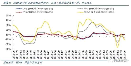 滬深300的凈利潤(rùn)同比增速為11.04%,較2019Q1的10.89%上升了0.15%,龍頭個(gè)股業(yè)績(jī)韌性仍強(qiáng);中證500的凈利潤(rùn)同比增速為-3.81%,較2019Q1的2.36%下滑6.17%;中證800的凈利潤(rùn)同比增速為9.35%,較2019Q1的10.04%下滑0.69%;除中證800以外的長(zhǎng)尾小盤(pán)股的凈利潤(rùn)同比增速為-12.03%,較2019Q1的9.74%大幅回落21.76%。從業(yè)績(jī)?cè)鏊俚谋憩F(xiàn)來(lái)看,龍頭股和小盤(pán)股分化明顯。