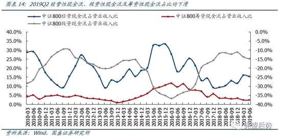 從現(xiàn)金流狀況來(lái)看,中證800指數(shù)的2019Q2的經(jīng)營(yíng)性現(xiàn)金流占營(yíng)收比為15.42%,較2019Q1的16.03%下降0.62%;投資性現(xiàn)金流占營(yíng)收比為-14.78%,較2019Q1的-13.76%下降1.02%;籌資性現(xiàn)金流占營(yíng)業(yè)收入比為2.39%,較2019Q1的2.48%下降0.08%,較上期的下滑幅度有所放緩。