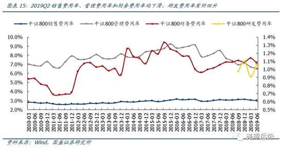 從費(fèi)用率的情況來(lái)看,中證800指數(shù)2019Q2的銷售費(fèi)用率為3.02%,管理費(fèi)用率為6.54%,財(cái)務(wù)費(fèi)用率為1.08%,分別從2019Q1的3.06%、6.72%和1.14%下滑了0.05%、0.18%和0.06%;2019Q2研發(fā)費(fèi)用率為1.06%,較2019Q1回升了0.15%。