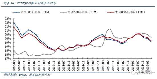 滬深300指數(shù)、中證500指數(shù)以及中證800指數(shù)2019Q2的毛利率(TTM)分別為19.2%、19.7%和19.3%,較2019Q1的19.5%、20.0%和19.6%均小幅回落。2019Q2期間,PPI持續(xù)下滑并跌落至0.00%,而CPI在豬肉價(jià)格大幅上升等因素的帶動(dòng)下持續(xù)上行,CPI與PPI的剪刀差走擴(kuò)。