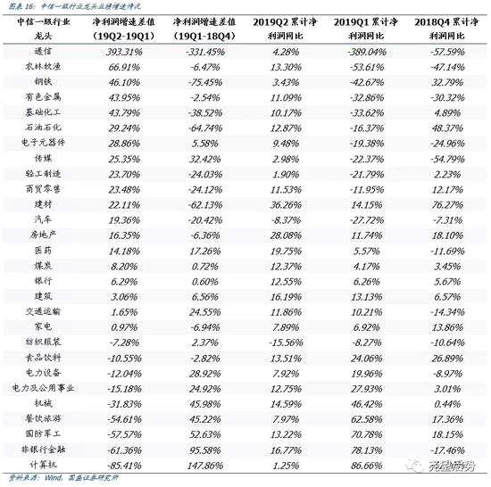全部A股整體2019Q2的凈利潤(rùn)同比增速為6.85%,較2019Q1的10.00%下降了3.15%;扣非凈利潤(rùn)同比增速為6.28%,較2019Q1的7.68%下降了1.40%。全部A股非金融2019Q2凈利潤(rùn)同比增速為-1.79%,較2019Q1的2.61%下降了4.40%;扣非凈利潤(rùn)同比增速為-2.05%,較2019Q1的-3.53%回升1.48%。