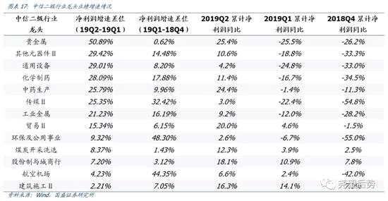 我們分析基于中證800的中信行業(yè)情況,可以理解為中信行業(yè)龍頭的業(yè)績(jī)。中信一級(jí)行業(yè)2019Q2大部分實(shí)現(xiàn)了業(yè)績(jī)正增長(zhǎng),其中電子元器件、傳媒、醫(yī)藥、煤炭、銀行、建筑以及交通運(yùn)輸行業(yè)實(shí)現(xiàn)了連續(xù)兩期的改善。中信二級(jí)行業(yè)中,2019Q2業(yè)績(jī)?yōu)檎鲩L(zhǎng),且業(yè)績(jī)連續(xù)兩期改善的行業(yè)有貴金屬、其他元器件、通用設(shè)備、化學(xué)制藥、中藥生產(chǎn)、傳媒、工業(yè)金屬、貿(mào)易、環(huán)保及公用事業(yè)、煤炭開(kāi)采、股份制及城商行、航空機(jī)場(chǎng)以及建筑施工。