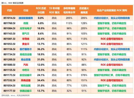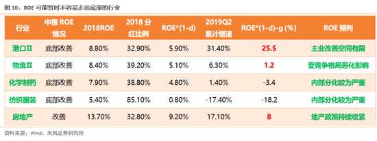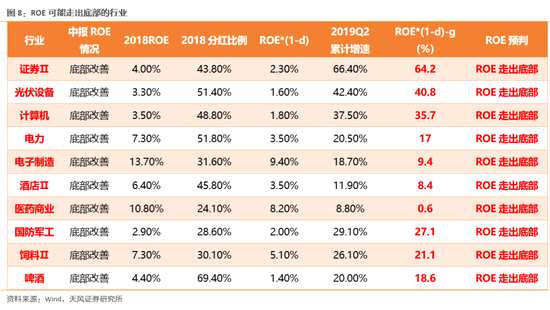 進(jìn)一步可認(rèn)為:若行業(yè)的19年中報(bào)同比增速g超過了18年年報(bào)的ROE*(1-d),則19年的ROE有較大的概率能夠得到提升。但這種推算,也存在一些不確定性。比如,若行業(yè)今年的分紅比例降低或經(jīng)營(yíng)效率降低,都有可能使得最終的ROE得不到提升;另外,對(duì)于以往由于虧損較多而導(dǎo)致分紅極高的行業(yè)也是失效的(比如表格中的養(yǎng)殖)。不過,這個(gè)思路,可初步幫助我們挑選一些ROE提升概率較大的行業(yè)。(1)ROE剛剛底部改善,并且可能走出底部的行業(yè):證券、光伏、計(jì)算機(jī)、電力、電子制造、酒店、醫(yī)藥商業(yè)、軍工、飼料、啤酒。(2)ROE可能延續(xù)改善或維持高位的行業(yè):保險(xiǎn)、旅游、白酒、電子元件、工程機(jī)械、醫(yī)療器械、調(diào)味品、乳制品、機(jī)場(chǎng)、航運(yùn)、通信傳輸設(shè)備、養(yǎng)殖。(3)ROE改善受阻或暫時(shí)難以走出底部的行業(yè):港口、物流、化學(xué)制藥、紡織服裝、地產(chǎn)。