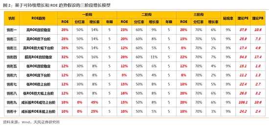 另一方面,可持續(xù)增長(zhǎng)率(不增發(fā)新股但可增加債務(wù))的極限速度是由ROE和股利分配政策決定的,以期初權(quán)益計(jì)算:可持續(xù)增長(zhǎng)率g=ROE*(1-d)。也就是說,上述模型中“d”(股息支付率)高低,隱含了roe的大小。這就意味著,不管是PE、還是PB的定價(jià)模型,都由ROE和g兩個(gè)變量所決定。這一看似簡(jiǎn)單的結(jié)論,在A股歷史上的 “定價(jià)體系”中,大部分時(shí)間都是被忽略的。導(dǎo)致這個(gè)問題的最根本原因是,在上方的定價(jià)模型中,A股歷史上的大部分時(shí)間,我們一直給短期業(yè)績(jī)?cè)鏊俚谋l(fā)力(g)的權(quán)重太高,而給長(zhǎng)期穩(wěn)定的ROE的權(quán)重太低。而更通俗一點(diǎn)來講,過去A股市場(chǎng)的投資者更加喜歡尋找和研究“跑得快”的公司(自然就給會(huì)短期g的爆發(fā)力以更高的估值權(quán)重),而忽略了“活得穩(wěn)定”的公司(也就是降低了長(zhǎng)期穩(wěn)定的ROE的估值權(quán)重)。但是,這種傳統(tǒng)的理念正在被顛覆,“定價(jià)體系”重塑的長(zhǎng)期過程已經(jīng)開始。在這里,我們將上方的模型擴(kuò)展為三階段增長(zhǎng)DDM股利折現(xiàn)模型,假設(shè):g1增長(zhǎng)T1年,分紅率d1;g2增長(zhǎng)T2年,分紅率d2;g3永續(xù)增長(zhǎng)。同樣,列舉出十種不同ROE增長(zhǎng)趨勢(shì)的情形假設(shè)。不僅是個(gè)股,估值模型的分析同樣適用于指數(shù)或行業(yè)。下圖的模型中,可以清楚的看到,長(zhǎng)期ROE的趨勢(shì),比短期的增速G,對(duì)于估值的影響要顯著的多。