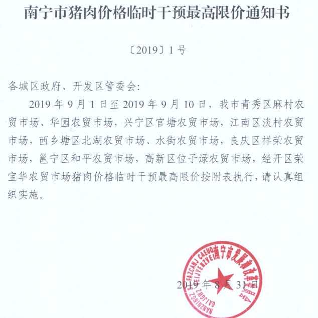 9月1日,廣西南寧市發(fā)改委出手,為穩(wěn)定豬肉市場(chǎng)價(jià)格,保障群眾日常生活,經(jīng)市政府同意,市發(fā)改委正式印發(fā)《南寧市發(fā)展和改革委員會(huì)關(guān)于實(shí)施豬肉價(jià)格臨時(shí)干預(yù)的通知》,從9月1日起實(shí)施豬肉價(jià)格臨時(shí)干預(yù)措施,在主要農(nóng)貿(mào)市場(chǎng)設(shè)點(diǎn)限量限價(jià)銷售豬肉。