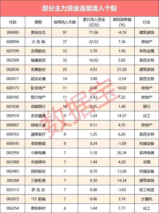 從股價表現(xiàn)看,主力資金連續(xù)流入期間,上漲的個股共有52只,漲幅居前的有寶塔實業(yè)、小熊電器、萬里馬等,漲幅分別為60.81%、26.34%、23.75%。跌幅居前的有美尚生態(tài)、夢百合、延安必康,跌幅分別為4.19%、3.65%、2.24%。